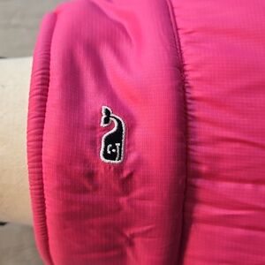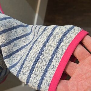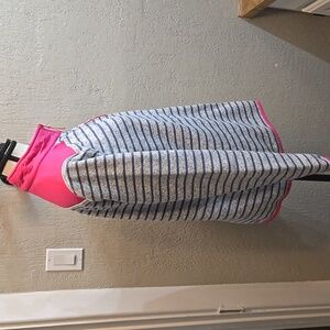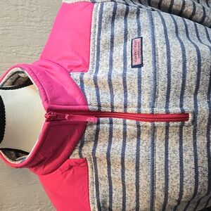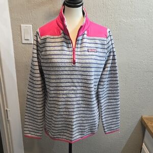This item is a Vinevard Vines 1/4 Zip Pullover Sweatshirt, often referred to as a "Shep Shirt". This specific style features a gray and blue striped body with vibrant pink accents on the collar, shoulders, and zipper.