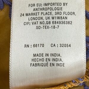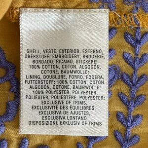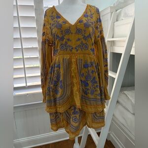 Anthropologie Meadow Rue Lisette floral embroidered mini dress in a yellow/mustard color with purple stitching and long balloon sleeves.j