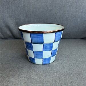 Charming checkered planter pot. Features blue and white pattern. Perfect for decor.