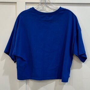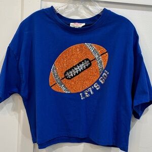 Blue tee with a bold orange football design. Perfect for sports events.