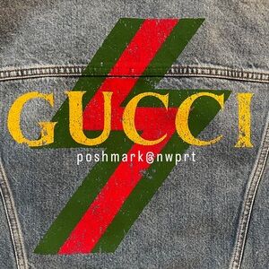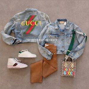 Denim jacket with a boxy-cropped fit. New with tags, from Elyse Walker. Painted graphic at back. 100% cotton. Branded button closures. See photos for measurements and Gucci size chart. IMO it has a roomy fit and can easily fit XS/S.