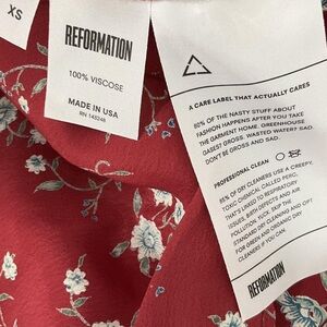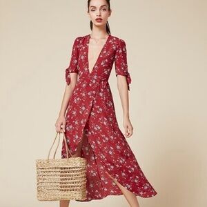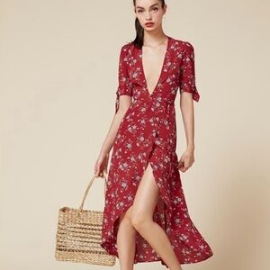 Chic red midi dress with floral print by Reformation. V-neck and tie waist. Perfect for day or night.