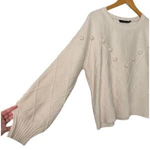 Features: crewneck, long balloon sleeves, ribbed trim, argyle knit with playful pom pom details, relaxed fit. Color: cream.