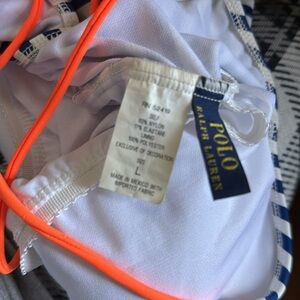 Classic Ralph Lauren one-piece swimsuit featuring chic blue, white, and orange stripes with adjustable drawstrings. Perfect for your next resort getaway, beach vacation, or cruise! Epitomizes Coastal Granddaughter style. Size Large.
