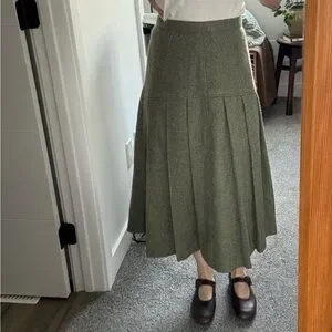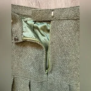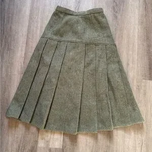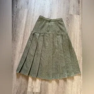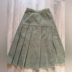 High quality hand-made vintage sage green pleated wool skirt. An incredibly unique and timeless piece that would elevate any outfit. It has a lining throughout and a secure metal clasp and zipper at the back.
