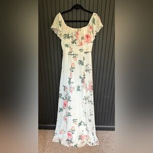 Chic off-shoulder design with floral print. Features a flowing silhouette. Perfect for elegant occasions.