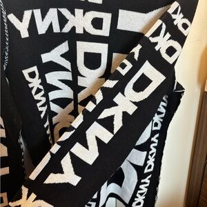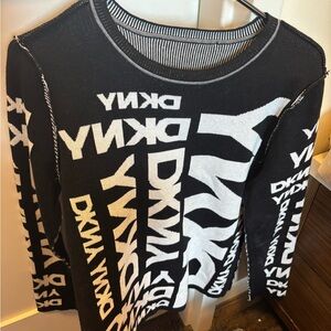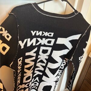 A stylish DKNY sweater featuring a bold black and white logo pattern. The sweater is designed with a crew neck and long sleeves, offering a modern and eye-catching look.