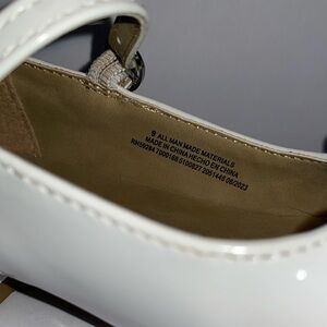 •White faux patent leather Mary Jane with adjustable buckle strap and non functional bow. Worn once for Easter.