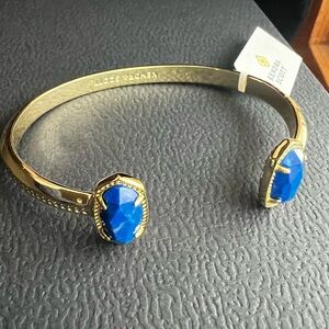 Beautiful Kendra Scott open cuff bracelet in a shiny gold-tone finish featuring two faceted deep blue stones on each end. Classic KS style with the signature textured/dotted detailing on the band.