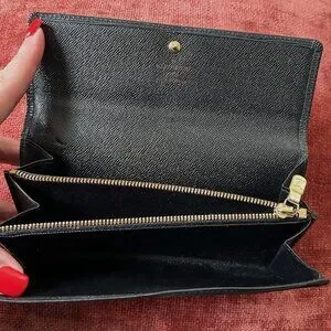This is a Louis Vuitton Epi Wallet in Black. This handy wallet is crafted of Louis Vuitton signature textured epi leather. The wallet has a front flap that opens to a partitioned cross-grain leather interior with a central zippered compartment.