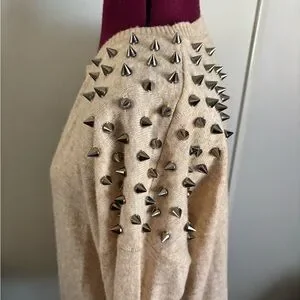 Stylish tan sweater featuring studded shoulder details. Perfect for a chic look.