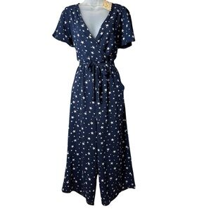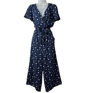 Fig & Olive Celestial Star Wrap Jumpsuit Pockets Tie Waist Wide Leg Navy L NWT