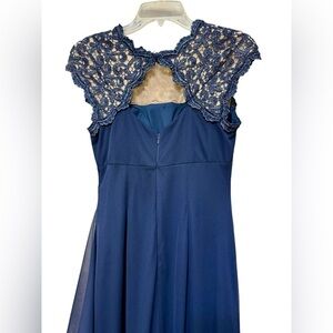 This sleeveless gown is fitting for a variety of occasions. It has a cascade ruffle skirt and metallic cut-out lace neckline. It is a dress that accentuates all body types and is perfect for a mother of the bride, guest of wedding or any special evening event.