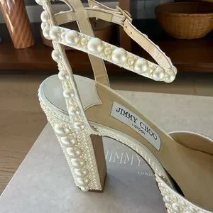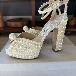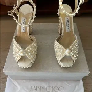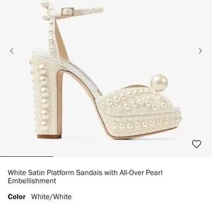 JIMMY CHOO White Satin Pearl Bridal SACARIA 120 Platform Heels 39/8, In Box, A++