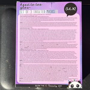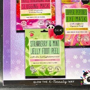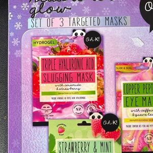 Trio of masks by Oh K! Includes specialized treatments for face, feet and eyes. Vibrant packaging with panda design.