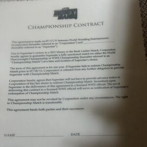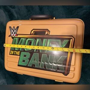 WWE MONEY IN THE BANK BRIEFCASE. Carry your essentials in style with this gold Money in the Bank briefcase. Perfect for fans and collectors alike. Sturdy durable plastic. Includes contract replica.