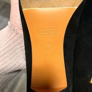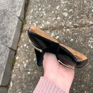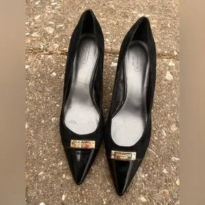 Chic black heels with a mix of suede and patent leather. Features gold-tone logo accents. Perfect for elevating any outfit.