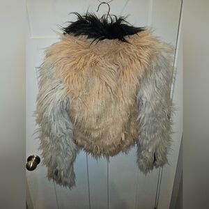 CHASER Faux Fur Moto Jacket Women’s Small – Beige Black Colorblock Shaggy Zip Co