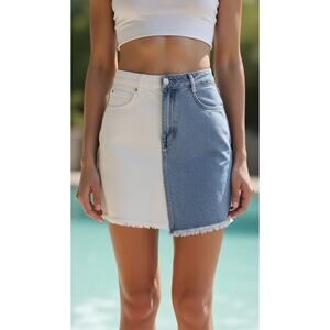 Keywords: Cloud Ten skirt, two tone denim skirt, colorblock mini skirt, high rise denim skirt, raw hem skirt, frayed hem mini skirt, women’s size small skirt, paneled denim skirt, blue denim mini skirt, 5 pocket skirt, button fly skirt, casual mini skirt, festival outfit skirt, summer denim skirt, streetwear denim skirt