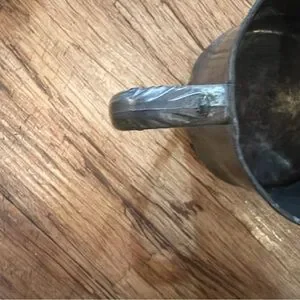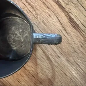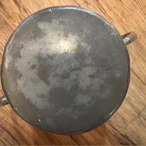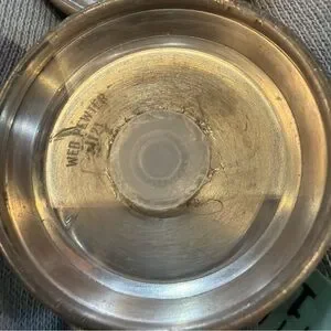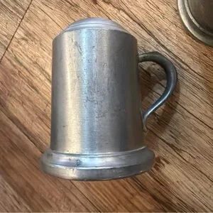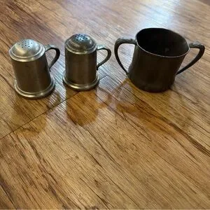 This product is a set of Wilton salt and pepper shakers, standing at 2 inches tall, made of pewter. The set also includes a child's cup or sugar dish marked as genuine. The shakers and dish are crafted in the United States by the Wilton brand, known for its quality and authenticity. All 3 items need polishing 1G