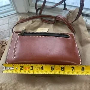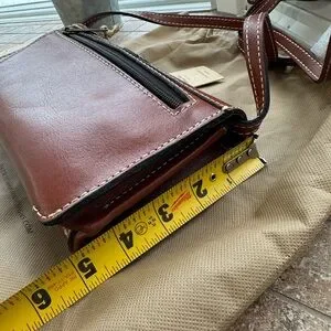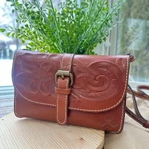 Chic Patricia Nash crossbody with floral embossing. Elegant tan leather. Ideal for versatile styling.