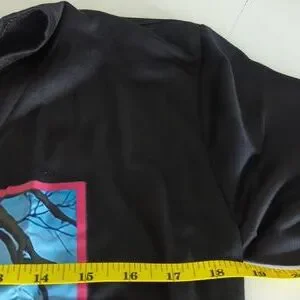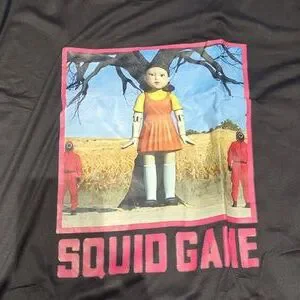Black t-shirt featuring a Squid Game graphic with red and blue accents.