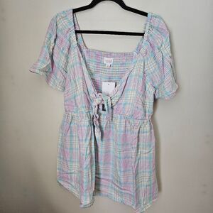 Gorgeous plaid shirt perfect for everyday wear. fun light colors for spring and summer. Tie front to make nursing easier.