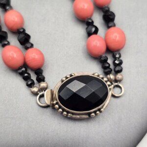 Art Deco Coral & Black Glass Bead Necklace 16" Sterling Silver Box Clasp