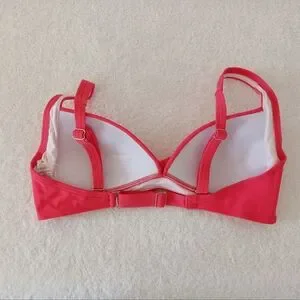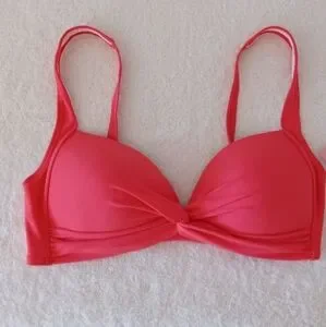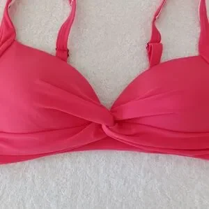 Stylish pink bikini top by VENUS. Features a twist front design. Adjustable straps for comfort.