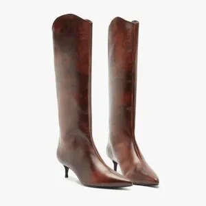 Crafted with a rich, burnt leather finish, these boots are unapologetic. The high shaft elongates the leg, while the sleek, pointed toe slices through the norm, offering a sharp, commanding look. Perched on a slim yet sturdy kitten heel, these boots are built for confidence without compromise.