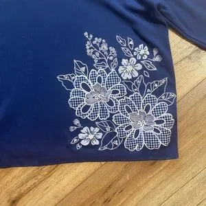 Alfred Dunner navy blue top featuring prominent white floral embroidery