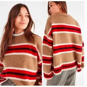 URBAN OUTFITTERS Brown Red Oversized Striped Boyfriend Sweater Wool Blend