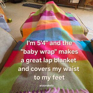 The tag says "Baby Wrap", but would a baby really appreciate this beautiful lambswool herringbone textile?? Pssh, I doubt it. This item measures approximately 43" x 29" not counting the fringe. You can drape it around your neck, wear it as a shawl, wear it as a triangle scarf, display it on the back of an armchair, or if you're a smaller person, you can use it as a lap blanket. I'm 5'4" it covers from my waist and completely over my feet.