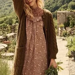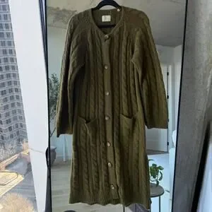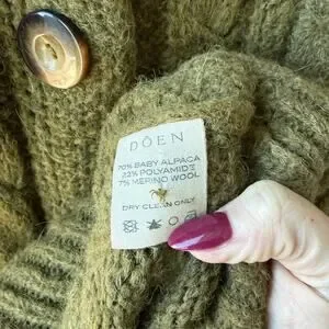 Doen Mesa Olive Green Long Wool Alpaca Cardigan Sweater. Women’s Size Small. Features button front closure, chunky cable knit, long duster length. Alpaca wool blend. Minor pilling.