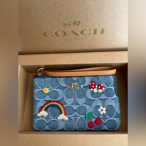 NWT Coach Corner Zip Wristlet with Colorful Embroidery in Signature Denim