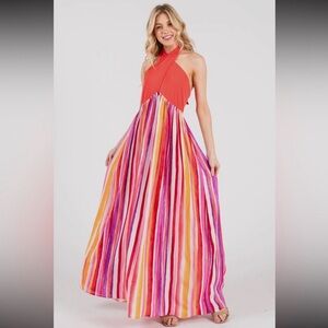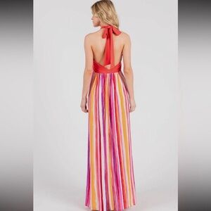Brighten your wardrobe with this Ces Femme backless dress. Features bold red, pink, and orange stripes. Perfect for making a statement.