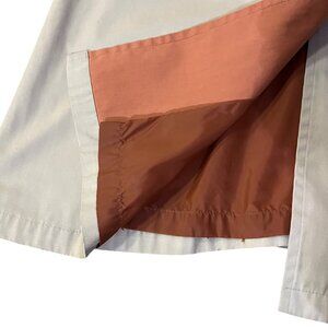 Classic vintage London Fog trench coat in a timeless khaki color with distinctive burnt-orange lining. This well-made coat has a structured silhouette and is ideal for spring and fall layering.