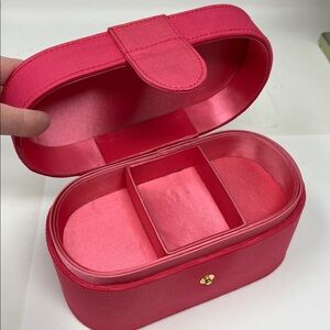 Lot bundle of 6 vintage brooches. And, vintage Estée Lauder jewelry box that is hot pink with satin and grosgrain.