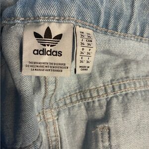 ADIDAS ADILENIUM SEASON 3 BANANA FITTED WASHED DENIM PANTS in size 34. They are made from 100% cotton denim in a wide-leg style. The pants feature a regular fit with a waist size of 34 inches and come in a light wash. These rare jeans are a must have! Y2K Adidas Denim. Small snag on the back bottom.