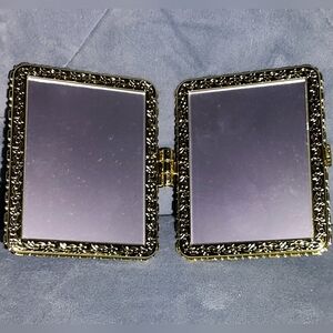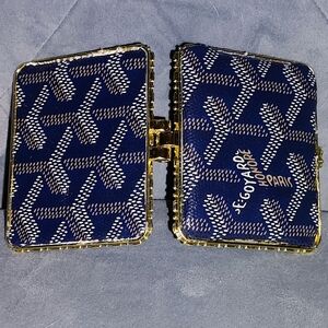 this has been UpCycled from a men's Goyard wallet in navy. top is padded bottom is flat. super cute handmade. mirror has a protective film over it. 2.8" x2.6"