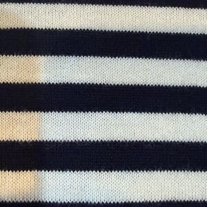 * Navy and white, gold metallic trim neckline.