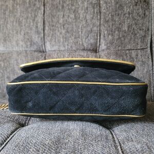 Two way bag, shoulder or crossbody. Suede with gold leather trim, and gold tone hardware. Interior is clean. Exterior has some spots that could use a light cleaning, as shown. Comes from a pet friendly smoke free home.