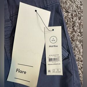 • Features: Belt loops; double faux buttons; seam detailing; flare leg
