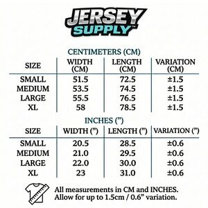 Measurements are included in the final photo. Jerseys are true to size unless explicitly noted as a slim fit.