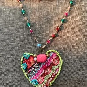 This necklace is a handmade bohemian heart pendant (created by me- so made with love imperfectly) then attached to a pre-loved 40” vintage glass beaded chain. It can be doubled to shorten fun to layer with draws the eye vertically which helps to elongate your figure!
