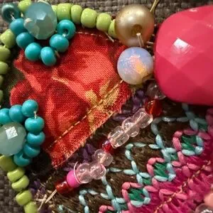 The pendant is made from repurposed fabric scraps, felt, lace, ribbons and trim which provide a rich, multi-layered background. There’s a lil secret love notes lace pocket on the back!