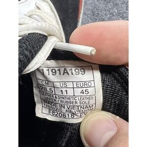 Tags and codes: Interior size label lists style code 1191A199, size US 11 / EU 45 / 28.5 CM, leather and synthetic leather upper with rubber sole, and production code F820818 FV.
