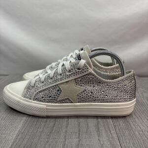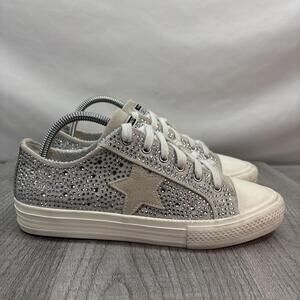 Add a touch of sparkle to your daily rotation with these stunning Vintage Havana Jenny sneakers. Featuring a dazzling all-over silver rhinestone embellishment, these low-top casual shoes are designed with a classic lace-up closure and the iconic star accent on the side. The distressed rubber sole provides both comfort and a trendy streetwear aesthetic, making them perfect for athleisure or elevating a casual outfit. Be sure to look at all pictures.