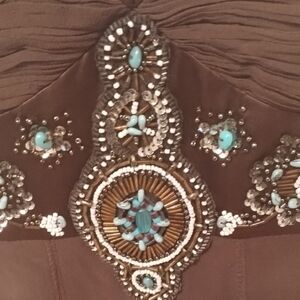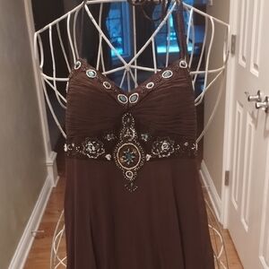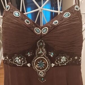 This elegant brown Sue Wong 100% silk halter dress. Beautiful intricate embellishments for a sophisticated look. Fully lined. Perfect for special occasions.