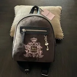 NWT Juicy Couture backpack featuring iconic embroidered crest logo and signature heart key charm.